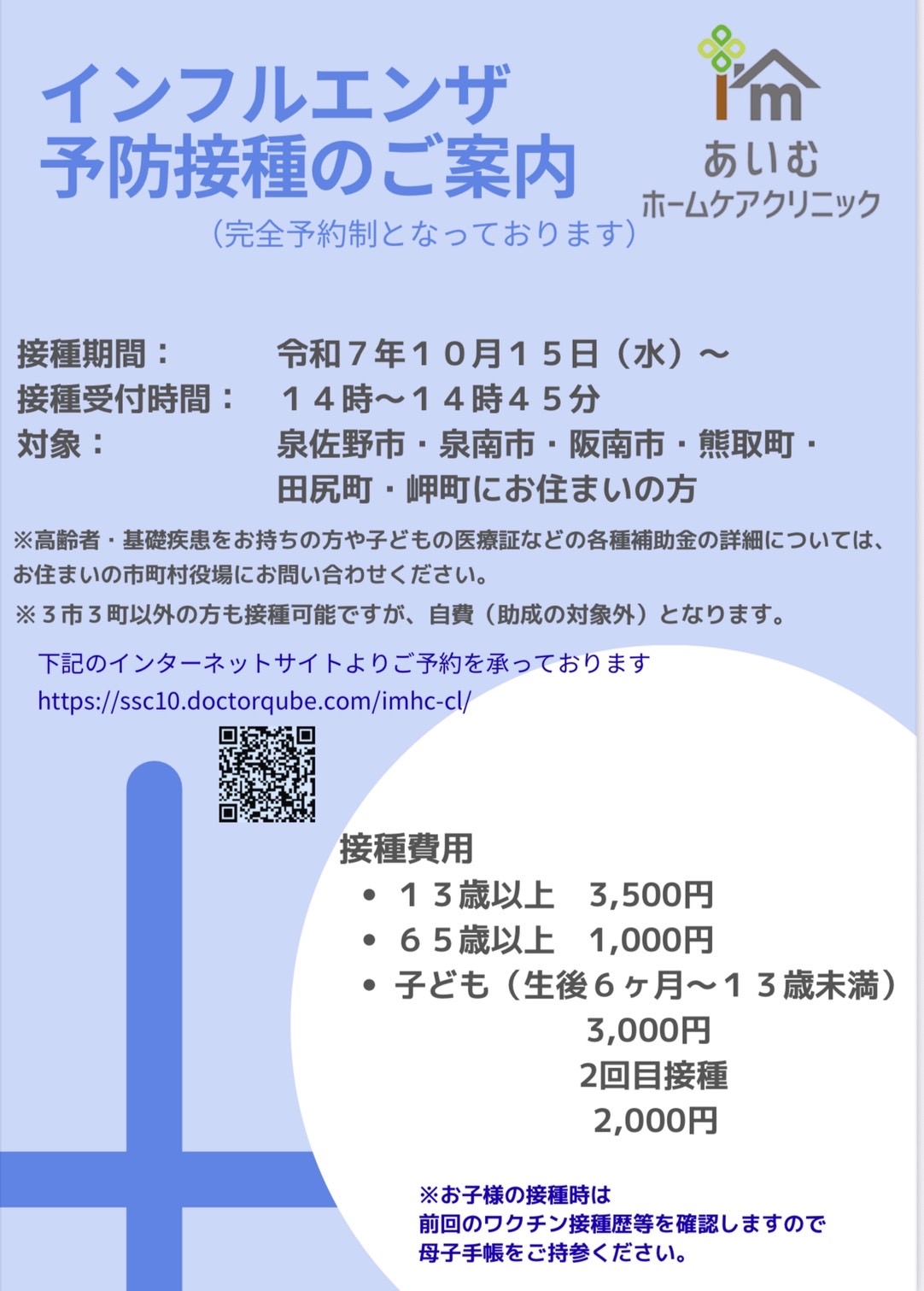 令和7年10月15日㈬よりインフルエンザの予防接種を実施いたします。(完全予約制となっております。)